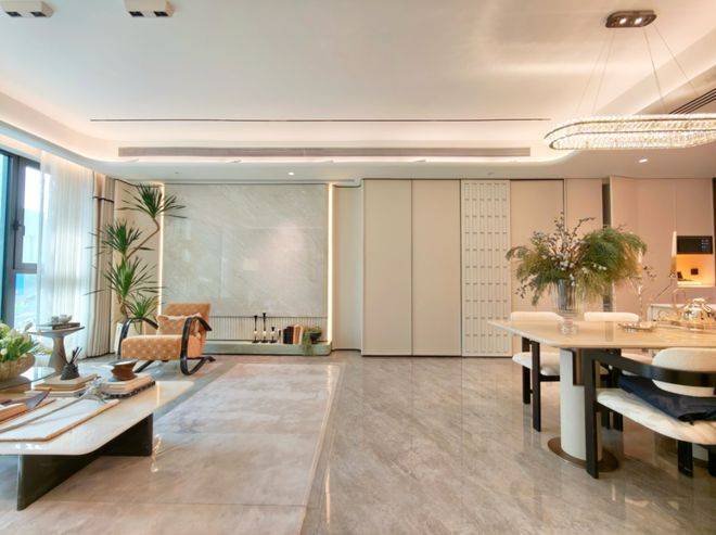 约5米超大宽厅设计,约9米纵深,餐客厨的空间大约在43㎡左右,空间感媲美市面上120㎡的户型。