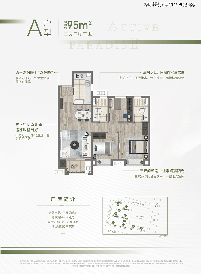 1、约95㎡的三房,南北通透,全明设计,三开间朝南,户型方正。