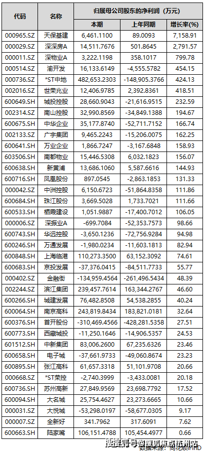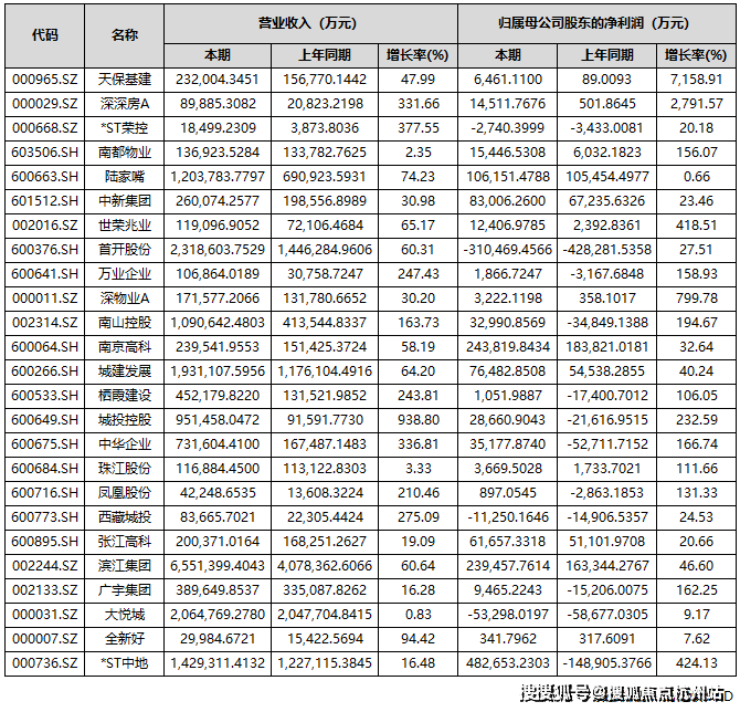 有37家房企实现归母净利润实现同比正增长。其中,天保基建、深深房A、深物业A、渝开发、*ST中地、世荣兆业、城投控股、南山控股、中华企业、广宇集团、万业企业、南都物业、新黄浦、凤凰股份、中洲控股、珠江股份、栖霞建设17家房企前三季度的归母净利润增长超过100%。