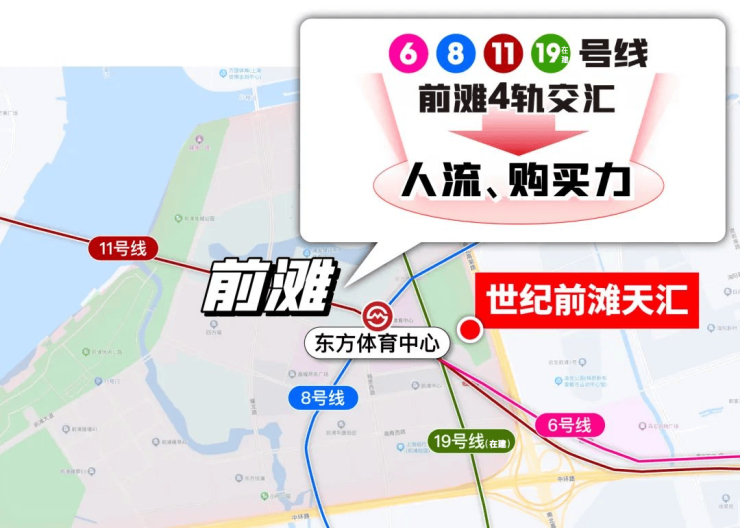 6/8/11号线以及在建19号线几乎将前滩的客户触角延伸到上海各个角落,来自传统市中心、徐家汇、虹口、杨浦甚至紫竹等地的购买力都能通过地铁汇聚在前滩。