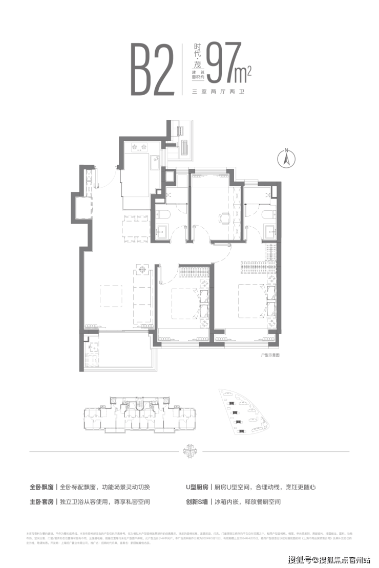 建面约97m²三房两厅两卫户型,全卧+主卫飘窗配置,并通过飞机户型空间布局,提升了空间的使用效率,让温情在自然中自然发生。