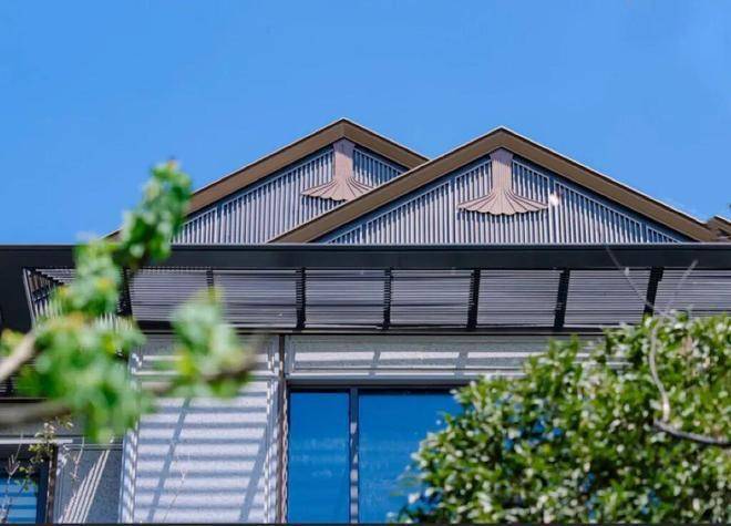 最值得一提的是项目立面采用古铜色铝板+木纹铝板+古铜色格栅+仿石铝板+陶土瓦,让建筑本身温润厚重从而历久弥新。