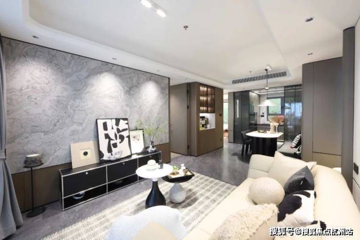 除了精装外,项目还有更多的品质感表现。例如客厅地面选用的是北京城建国誉府高定的温德姆灰大理石瓷砖;简一大尺寸瓷砖,拼缝仅0.35mm,工艺复杂,几乎无缝,整体性强