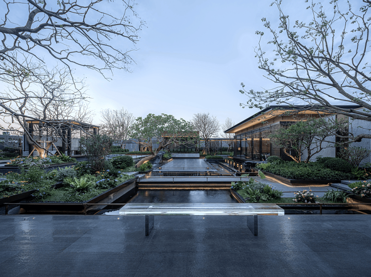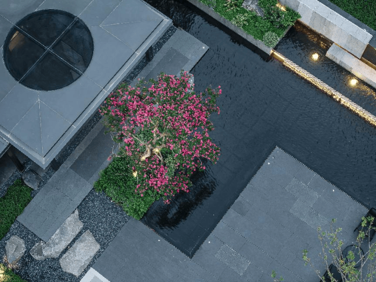 项目更让人惊喜的是:打造了长约200米,近1000平的灵活水系覆盖整个社区,并将静水、跌水、瀑布等不同形态水景观置入,形成五种风格的水景观。