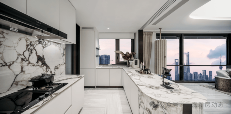 如宝格丽大理石打造的西厨岛台、铂浪高的净水三合一水龙头和一体式大水槽、霍尼韦尔的前置过滤器、全屋软水以及末端净水器系统、来自意大利法罗力燃气热水器、德国唯宝卫浴、当代龙头及花洒......还有全屋华为智能家居系统配置。这一套组合,是真正意义上的顶豪序列配置!