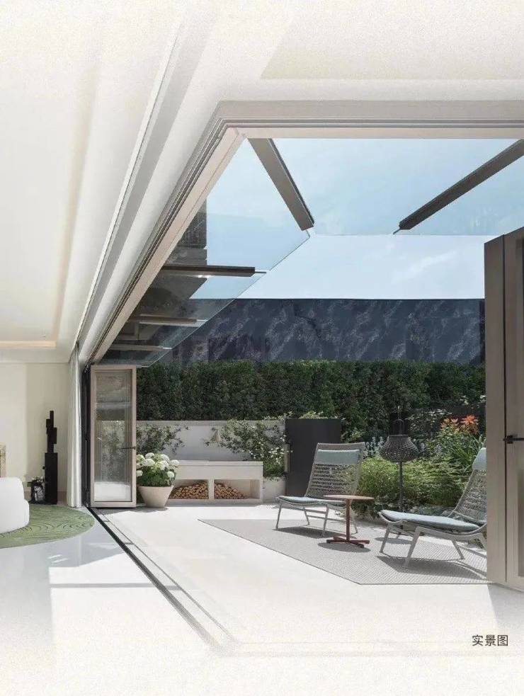 「无界空间」:客厅270度转角无柱设计,搭配落地玻璃,开阔视野将院中风景迎入日常。