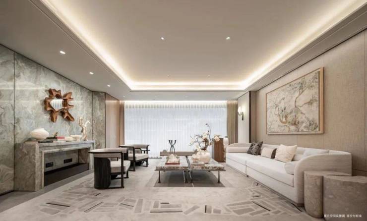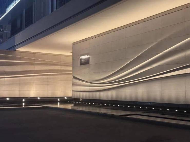 采用米黄色温润石材,巧妙模拟风的流畅形态,营造出既庄重又舒适的归家氛围。这片宽广的流线型石墙在柔和灯光的映衬下,更显璀璨夺目,而风雨连廊的灯带设计,更添一份尊贵仪式感。