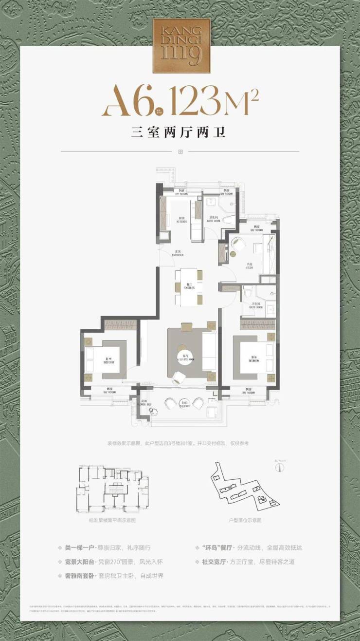 建筑面积约123㎡三房户型,飞机式布局,一镜到底的LDKB长厅,尽显隐贵静安风范;