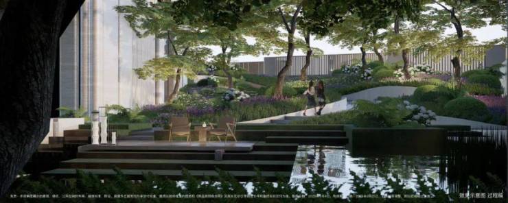 小区做了抬高处理,整体抬高,最高处超过7米,整个小区形成了错落的格局,在小区内部做台地景观。所谓台地,便是将小区内地面整体抬高,与市政道路形成一定的高度落差,这样建造的社区气势磅礴,居高临下。通过景观设计,将小区景打造成了立体台地花园,设置缓坡、下沉式花园、台阶等,让整体景观表现出立体层次感,错落有致。
