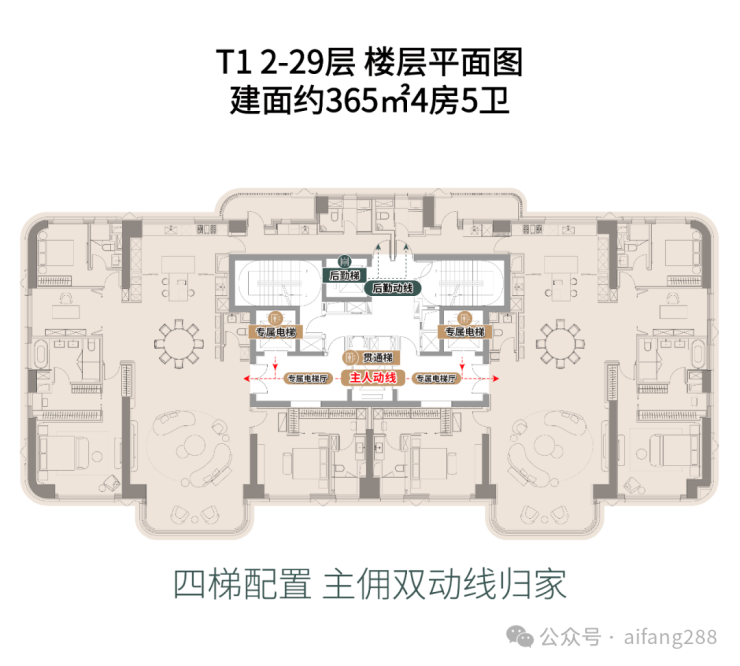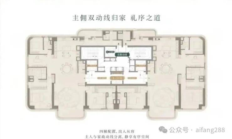 罕见四梯两户配置(3部主人梯+1部保姆梯),延续一期独门独户专属电梯门厅,二期尺度更显阔绰。同时,通过家政后勤动线与主人归家动线的分离设计,拉满居住的秩序感与私密性。