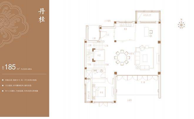 房屋实际可用面积要比户型图标注面积大一些,以“丹桂”户型为例,户型图标注的建筑面积为185m²,但是层高最高处可达到9.9米,未来完全可以搭建二层,搭建后,地上使用面积可以达到约280m²左右;
