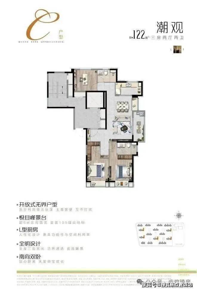 精工户型,高得房率:主推建面约100㎡三房(三开间朝南,得房率超80%)及120-122㎡三房(四开间朝南,主卧套房设计),全卧室飘窗、宽面阳台,精装交付,甄选大金中央空调、威能地暖、博世厨电等国际品牌。