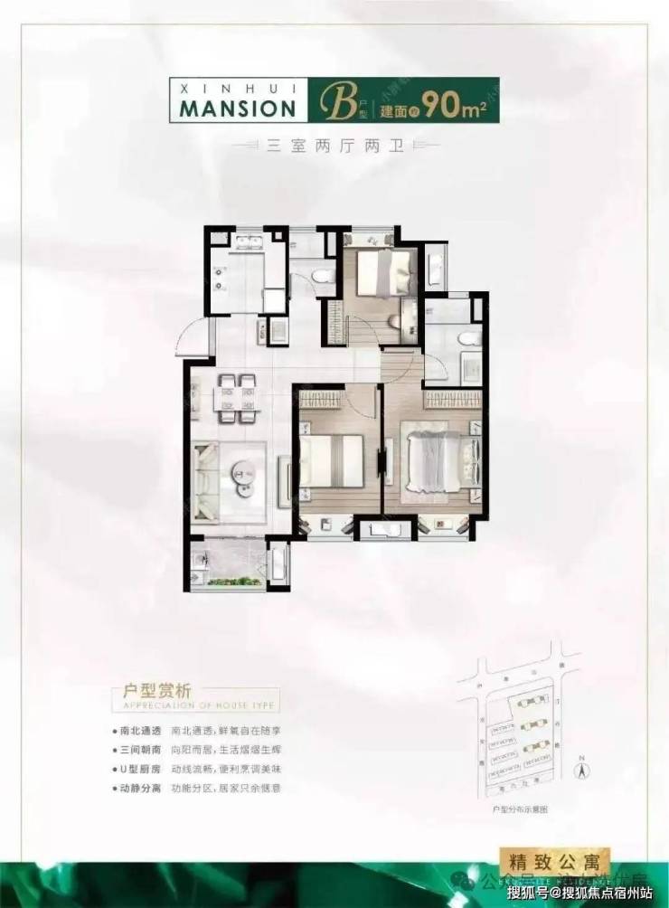 建面约86㎡3房2厅1卫户型特点: 做到了双开间朝南+双阳台设计+卫生间干湿分离,一个非常紧凑的小3房户型。