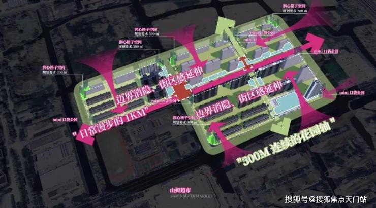 这些丰富的生活场景,则由两条景观轴线串联:一条是约300米的连续花园轴;一条是约600米的日常漫步街区。