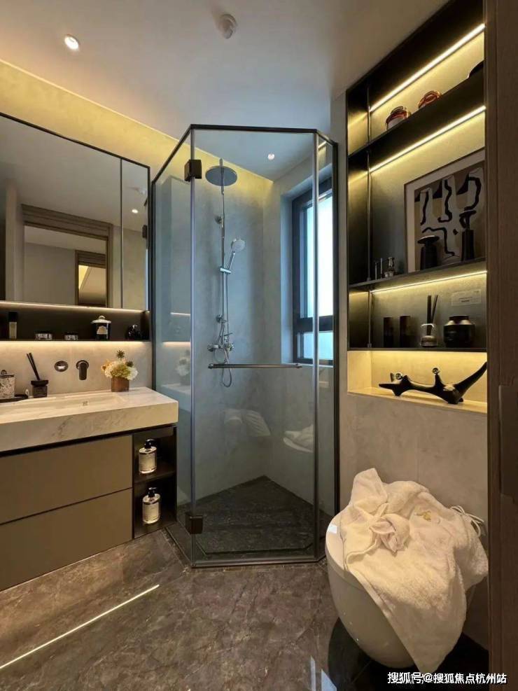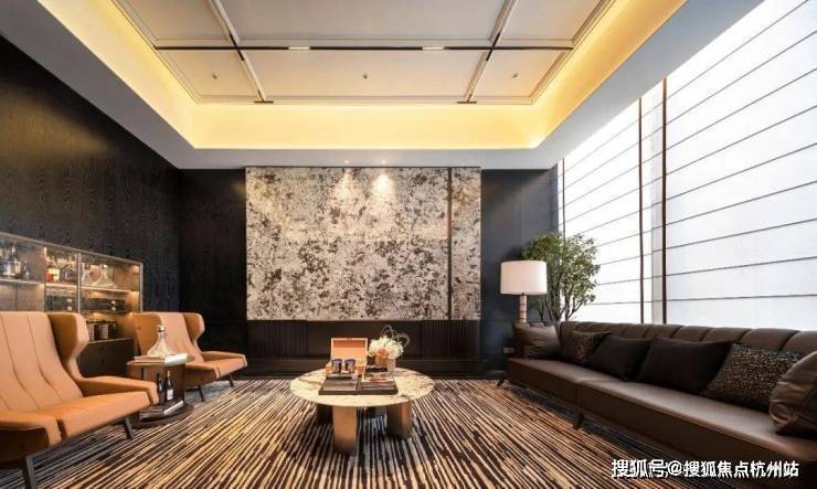 而人行线路则由星级酒店式的入户大堂进入,接着便是6S会所环绕的下沉式水景庭院,约7米高磅礴大气的水景墙配合乌桕林和原石、浮桥交错的地面水景,若是傍晚归家,还能欣赏倒映在水中的点点星光,可谓满满的奢雅意境和尊贵仪式感!