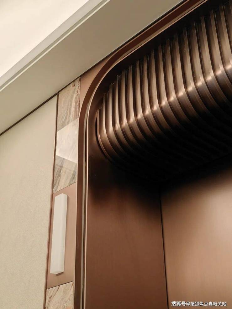 电梯区域以铜色金属包裹,弧线门头造型蕴含雕刻般的工匠精神,赋予空间流动美感。