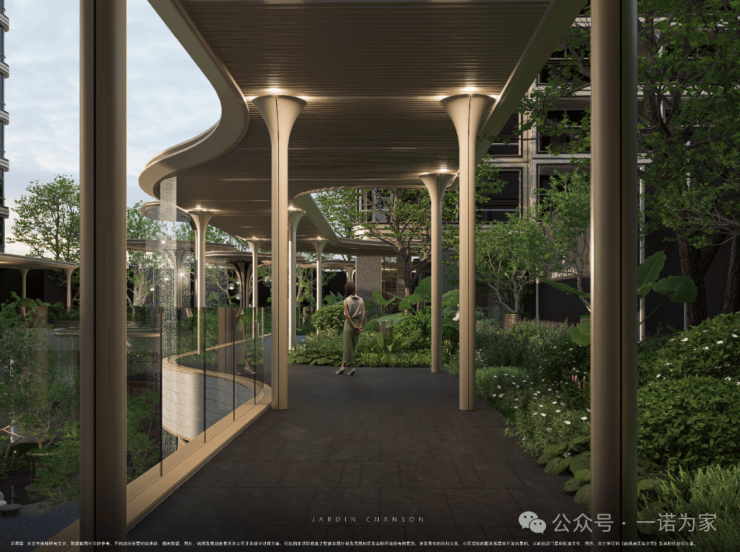 风雨连廊覆盖约三分之二楼栋,巧妙连接着高层核心景观节点和功能空间,即使是雨天,业主也能从容漫步至单元门或会所。