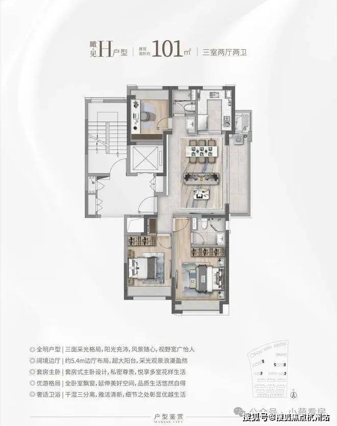 ③建面约101㎡H户型:三面采光,全能景观王炸边厅户型!