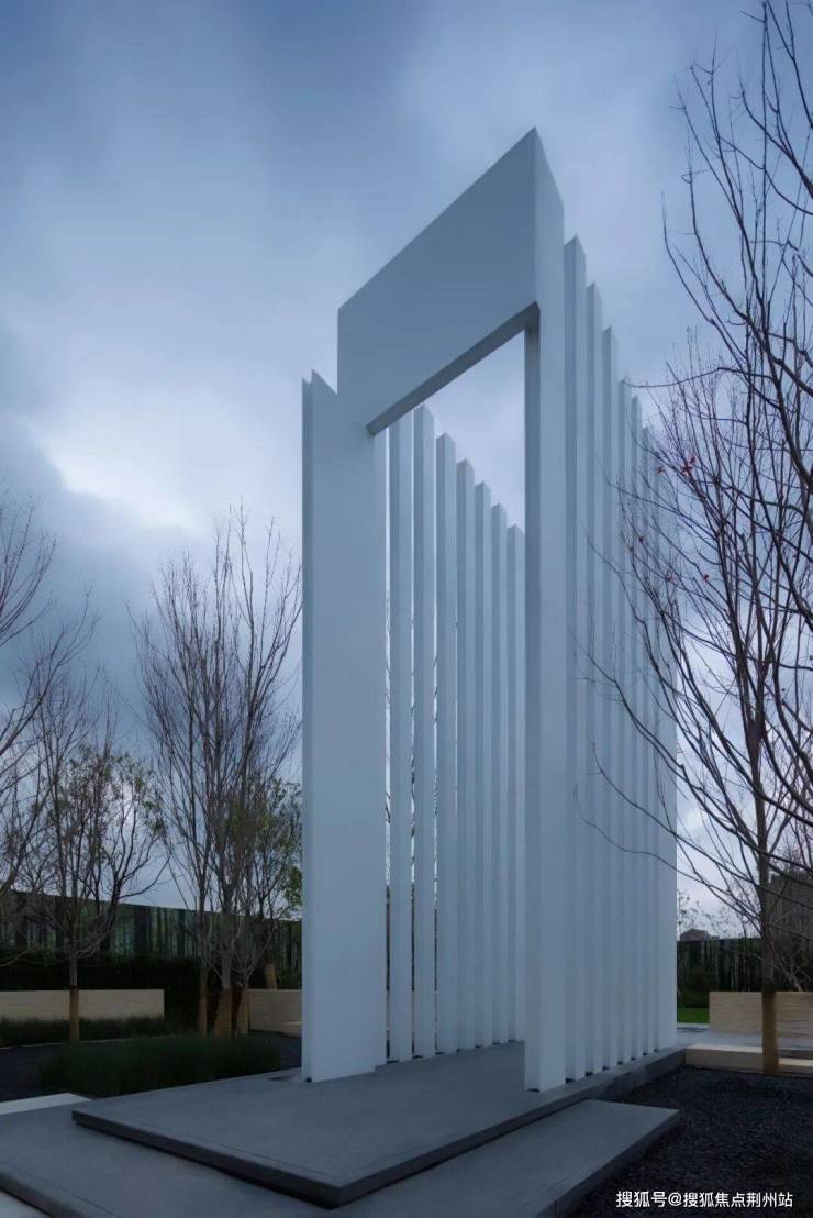 超2万㎡的实景示范区,成为理想生活的具现化展示。四季隐秀通过约10米高的“精神之门”来营造出强烈的空间感与仪式感,“精神之门”以白色立柱为主角,线条简洁流畅,既体现了现代建筑的极致美学,又以其灵动的设计语言传递出空间的轻盈感。立柱高耸的结构不仅划定了场域的边界,更形成了一种向上的张力,引导人们在视觉与心理层面感受生活的延展与升华。