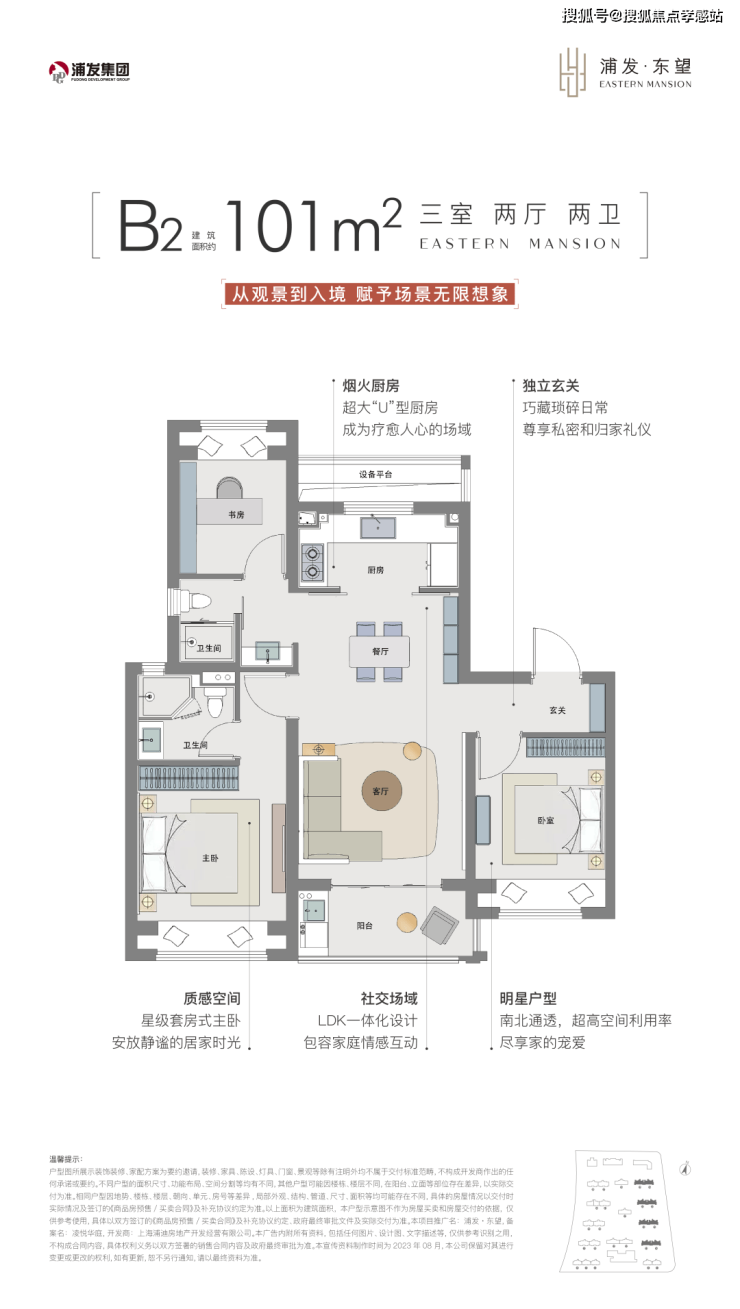 建面约101㎡B1户型尺度感惊人,约5.2米南向面宽的客餐厅以及阳台,为室内带来了非常出色的采光度。