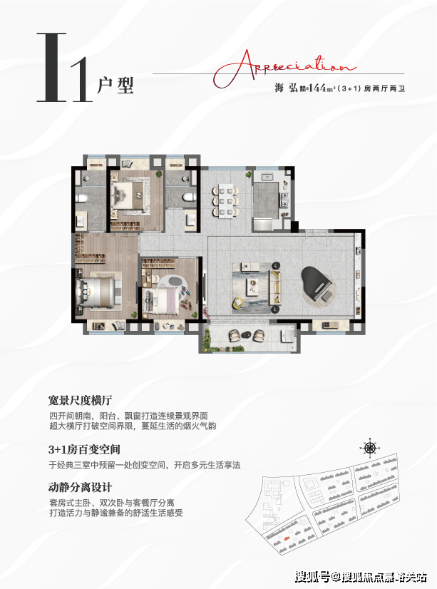 上实•听海推出了全生命周期户型产品,以空间一体化的设计,消除一定的空间界限,用更科学的空间尺度诠释改善人居的可能性,更以全飘窗设计,更好的感受超大海景界面带来都市难寻的瞰海居住体验。