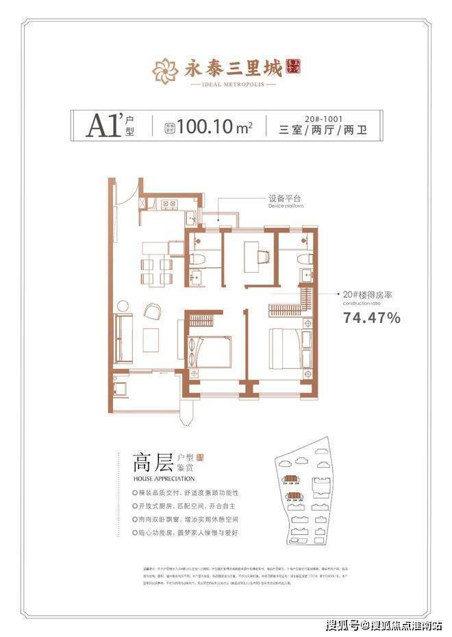 高层(16-19层):99-151㎡三房,得房率78.6%。