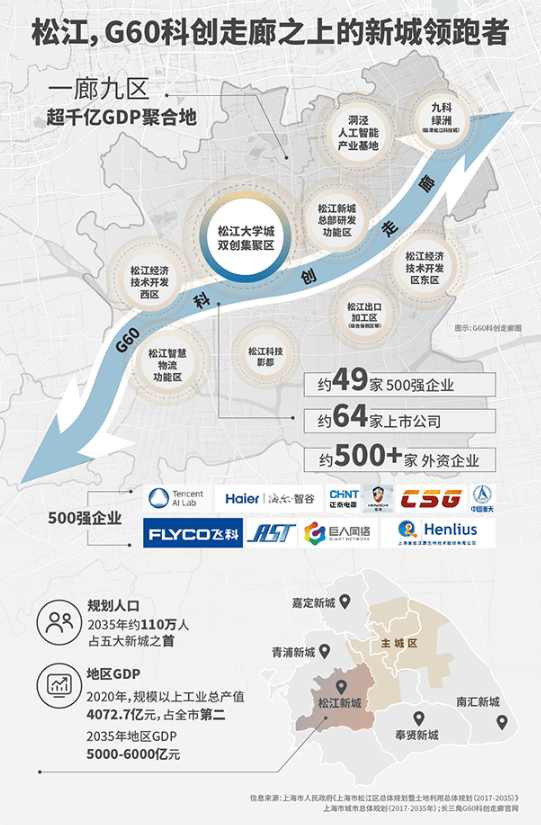 G60科创走廊是松江的名片,集聚了近50家世界500强、约64家上市公司、约500+家外资企业,贡献了松江约90%的工业产值,占上海工业产值近10%(来源上海松江)。