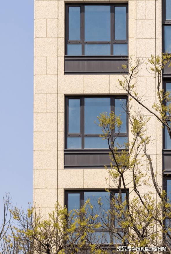 外立面采用 浅色系全石材干挂,巴西都伯斯金麻、宏宇金麻搭配铝板,在阳光照耀下,闪烁着温润光泽。