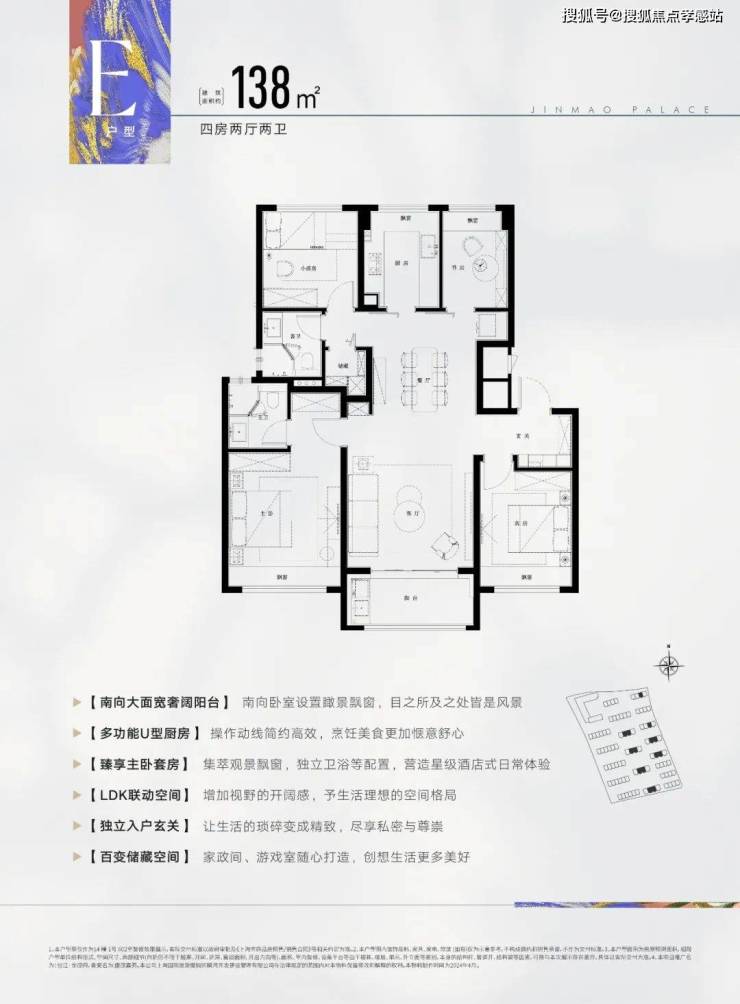 此户型为飞机户型,可以说是改善人群非常喜欢的户型,建面约138㎡4房2厅2卫设计,动静分区,三开间朝南,各空间尺度奢阔,还有一个大面宽景观阳台,实现功能性和舒适度兼得。