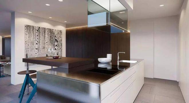 至于厨房,引进奢华橱柜品牌Bulthaup(巴托普),通常来说,汽车原厂漆的烤漆喷涂需11道工序,而Bulthaup橱柜的环保高光烤漆工艺达12道。触感犹如钢琴琴键那般丝滑。