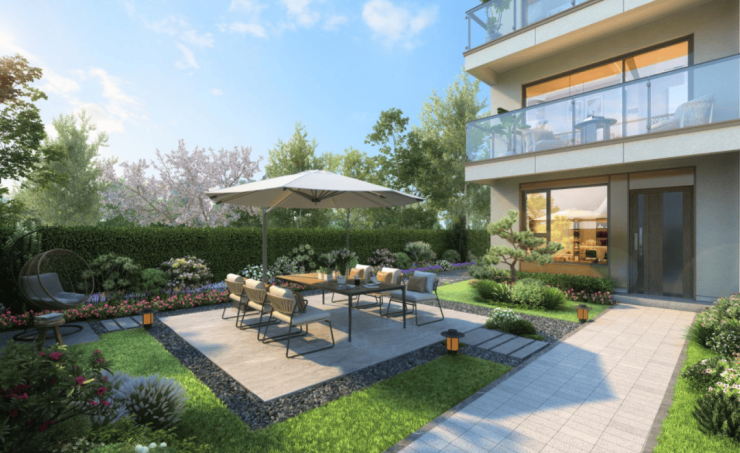 下叠精髓是亲近自然的庭前绿地,面积可观,延展出大家庭多种居住的可能性。