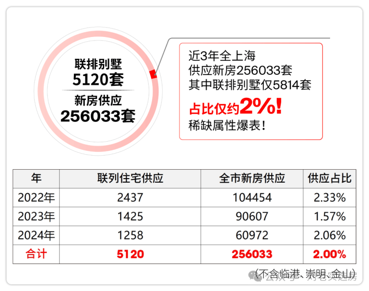 在2022年上海还有2437套通勤时间可控的联排产品入市(排除崇明、金山、临港等极端偏远地区,下同),2023年锐减至1425套,2024年则只有1258套,占比新房供应总池子仅约2%,百里挑二的改善机遇!