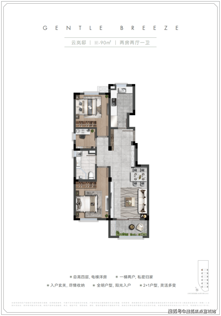 洋房:总高 4 层,采用一梯两户设计。主力户型为 80㎡两室两厅一卫和 90㎡两室两厅一卫,其中 80㎡户型有 144 套,90㎡户型有 48 套;交付标准包含精装和毛坯两种,一楼不带花园。