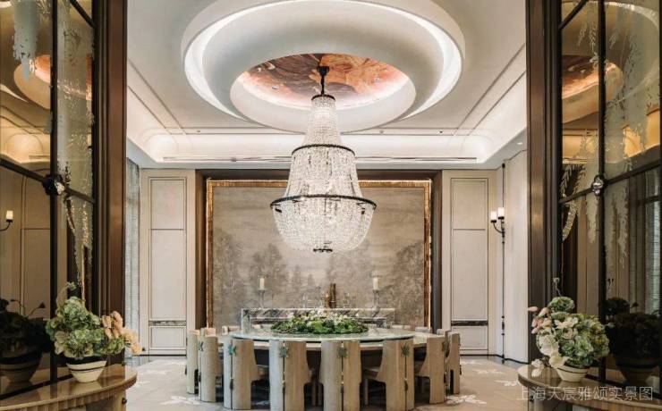 在景观落地窗环绕中,私宴厅以“花廊序列,美学对景”构筑专属的私谧空间,巨型水晶吊灯与浅色饰面的搭配,色彩质感上相得益彰,营造融合艺术、文化与生活美学的奢享感场域,成就令人神往的优雅社交范式。