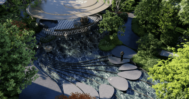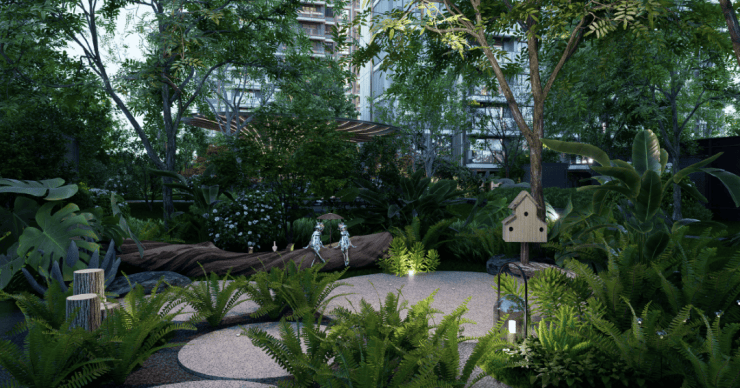 九园:潮汐花园(社区外围口袋花园)、浔湾秘境(会所式入户)、社交剧场、漫游森境、下沉会所、阅读花园、社交花园、自然博物馆。
