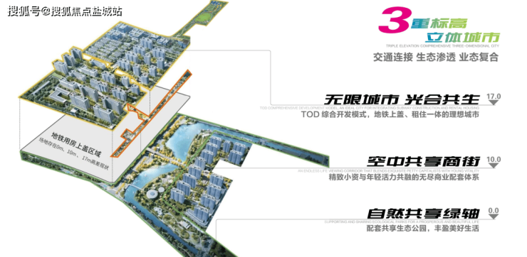 二度 标高10m:配有生活服务配套,商业、公园、办公。1万㎡精致生活配套 、 盖上商业文化、体育文化、养老医疗、行政管理健康四轴。