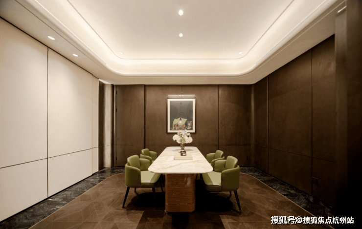 室内墙面大面积铺设温润质感的 木饰面 ,墙面转角处采用曲面处理,为空间注入温馨舒适的居住氛围。
