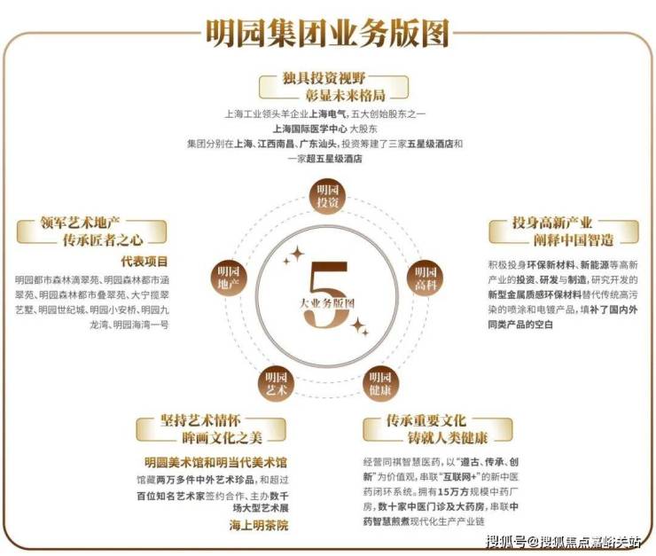 明园地产、明园投资、明园艺术、明园健康、明园高科五大业务版图