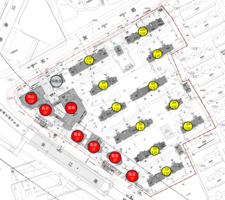 根据设计方案显示,项目拟建11栋12-18层可售住宅,总户数876户,可售住宅约807套;另需建设1栋保障性住宅房,靠近长江南路一侧规划有酒店、商业、菜场、社区食堂等业态。
