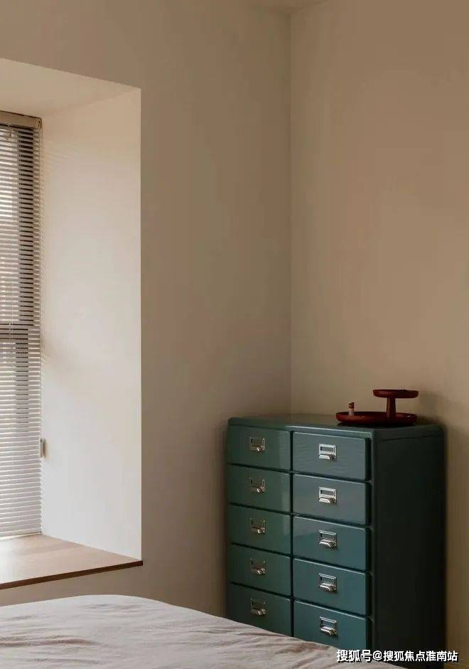 床头的托盘小桌、复古“交叉腿”凳几,葫芦陶瓷台灯,床尾一组深绿铁皮斗柜,带来时尚、复古感。
