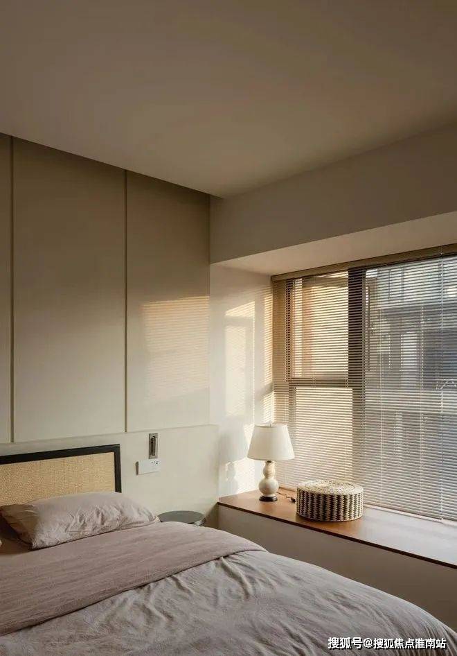 睡眠区使用大量木质元素来呼应窗外的绿意:飘窗、床头背景墙和地面,均使用相同的木地板,保持房间整体性,也加深自然氛围。