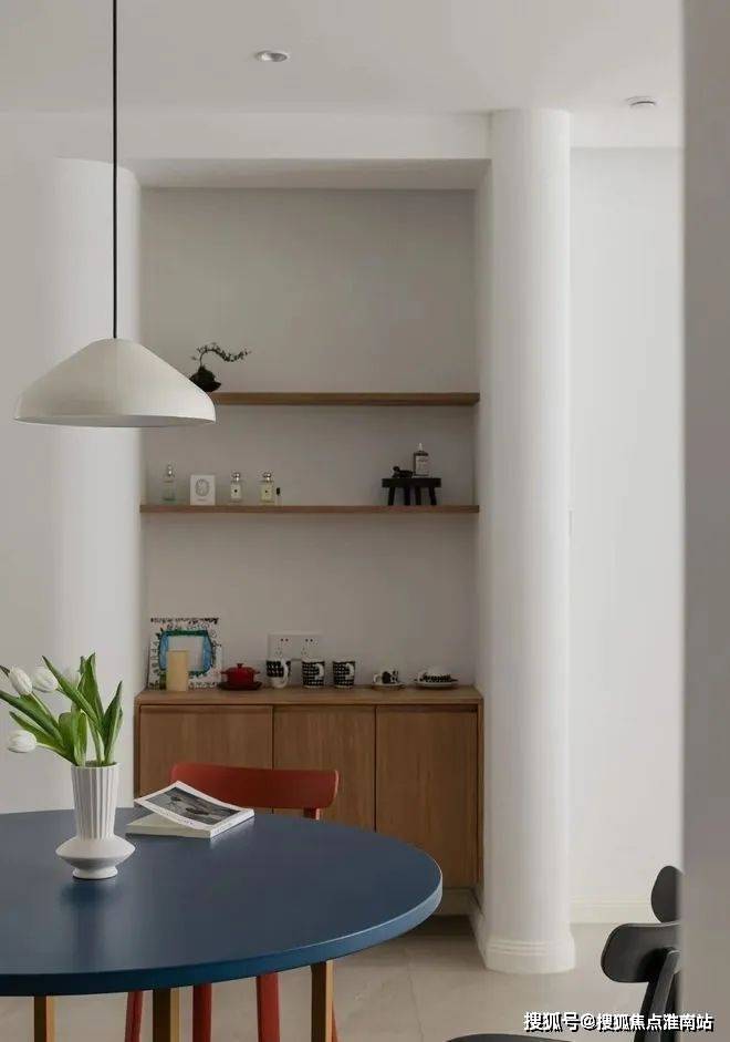 餐桌椅在材质与色彩上,均为低饱和度,且造型流畅、简约,与全屋的白+木和谐搭配。