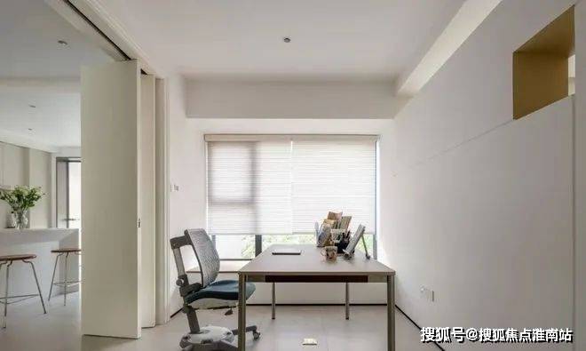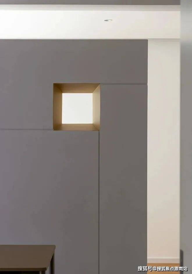 睡眠区与书房之间,用不到顶的墙体隔断,上方留空与右侧的方洞造型,增强两个空间的联系感。