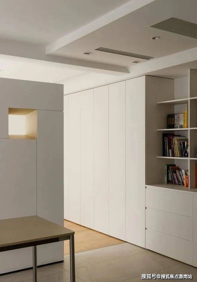 一排顶天立地柜从睡眠区延伸至书房,利用封闭柜与开放格,整合卧室与书房的储物。