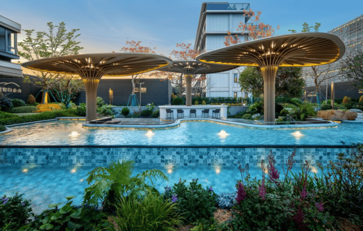 同时,国贸利用社区临河的天赋,打造了一座约150米林荫水院,植入了多个亲水平台,实现业主露营、运动、休憩等多样化场景。
