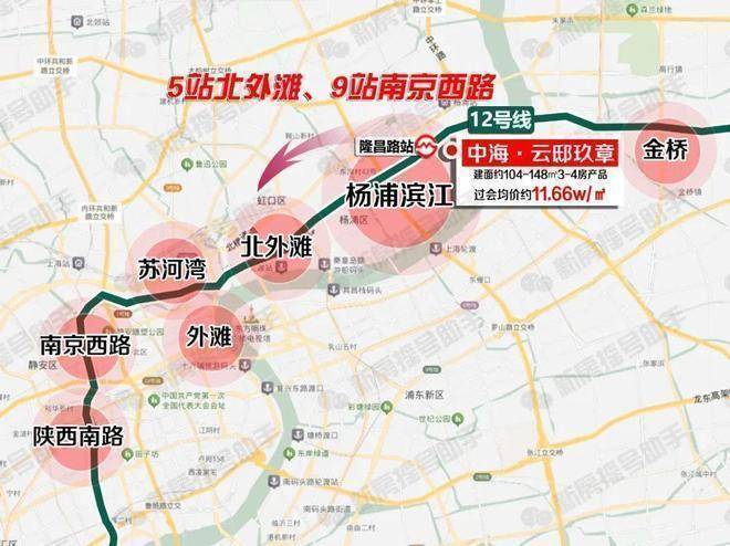 中海·云邸玖章直线约450米换乘之王12号线隆昌路站,5站北外滩,7站陆家嘴、8站人广(需换乘),9站直达南京西路!