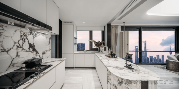 如宝格丽大理石打造的西厨岛台、铂浪高的净水三合一水龙头和一体式大水槽、霍尼韦尔的前置过滤器、全屋软水以及末端净水器系统、来自意大利法罗力燃气热水器、德国唯宝卫浴、当代龙头及花洒......还有全屋华为智能家居系统配置。这一套组合,是真正意义上的顶豪序列配置!