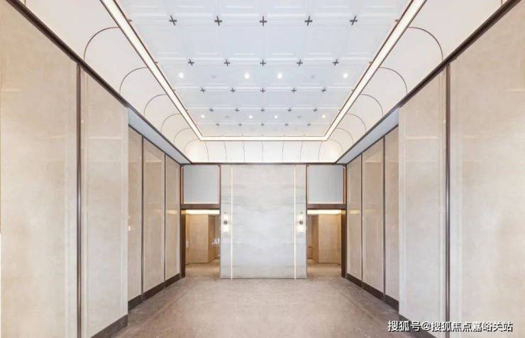电梯区域以铜色金属包裹,弧线门头造型蕴含雕刻般的工匠精神,赋予空间流动美感。