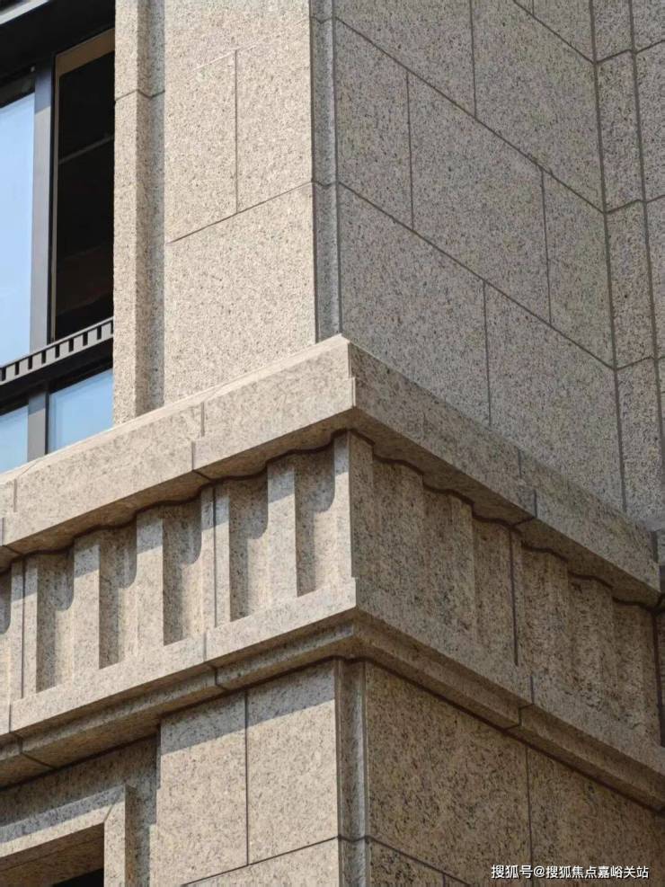 立面更是纯粹的浅色系全石材干挂,巴西都伯斯金麻、宏宇金麻等石材搭配铝板线条,展现出一种纯粹而高雅的美感。