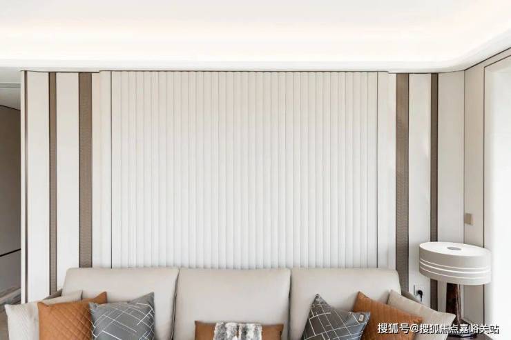 电视背景墙一整面的皮质包边外,车线和金属边工艺形成是竖向线条,整个厅的舒适体验与气场是其他同级项目乃至豪宅难以比拟的。